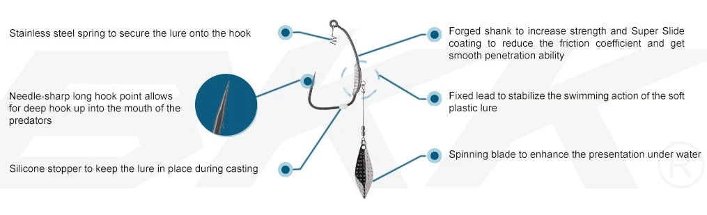 The BKK Titan Diver is the new, upgraded version of the BKK Titan Rider, designed for weedless-style rigging of larger plastics. It features all the characteristics of the original Titan Rider – a locking spring to secure the plastic lure, a silicone stopper to keep it in place and the Super Slide coating – boosted by the addition of a fixed lead to take the fishing action deeper in the water, scouting sunken structures where predator fish may dwell. The lead in turn features a stainless-steel ring to allow for the attachment of a spinning blade, improving the appeal of your lure.